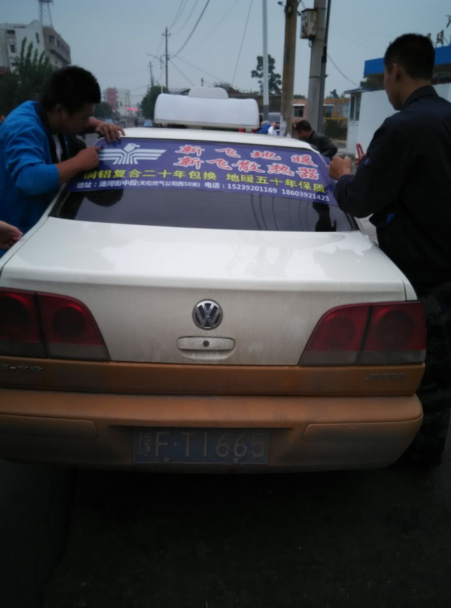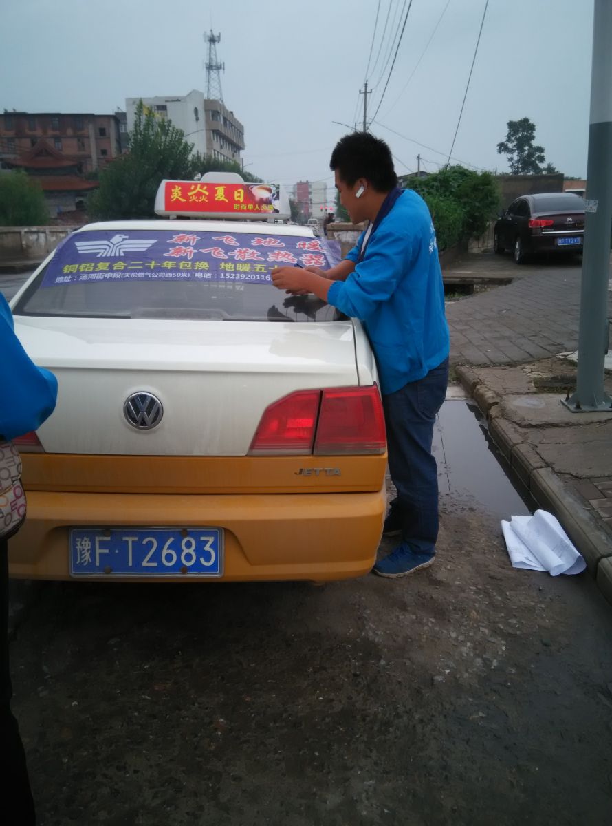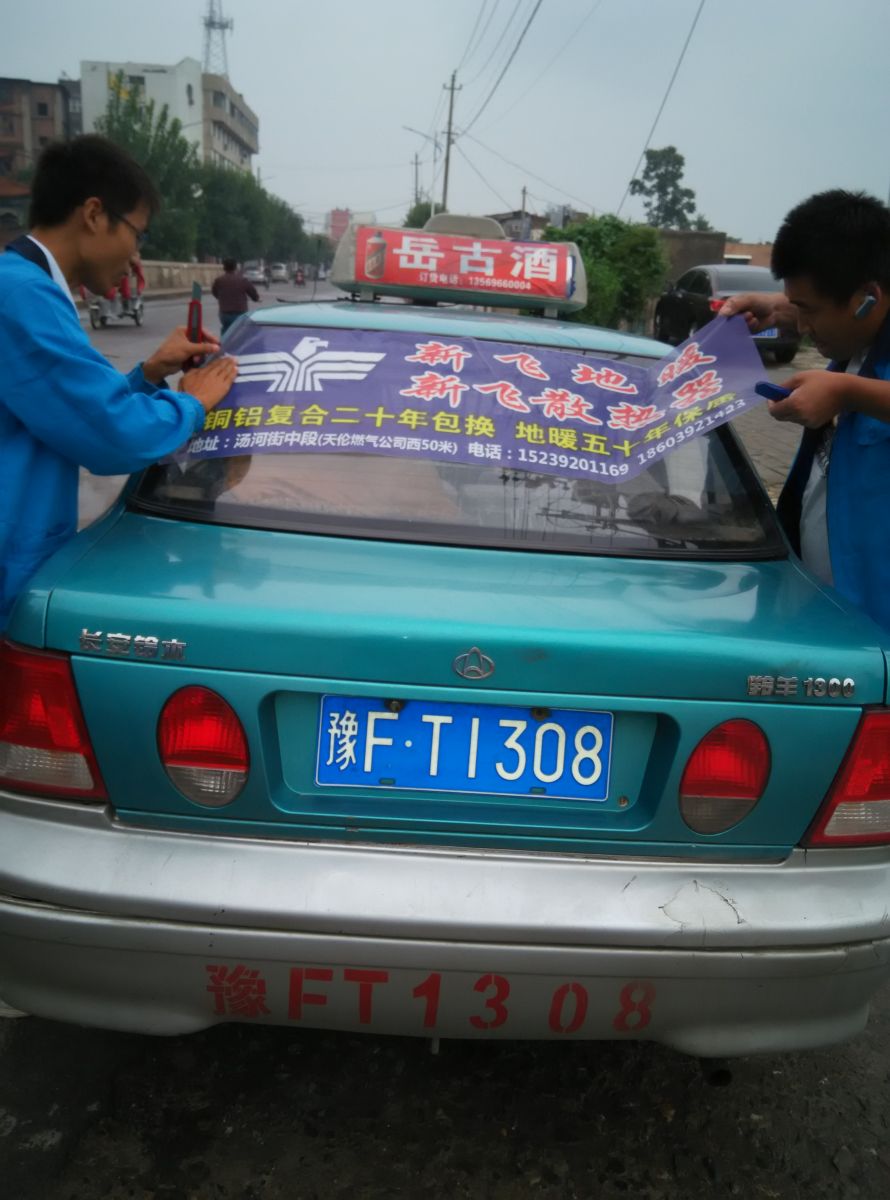 為響應(yīng)新鄉(xiāng)市新飛散熱器有限公司十一優(yōu)惠政策,鶴壁代理商王經(jīng)理在全市舉行團(tuán)購(gòu)簽購(gòu)會(huì),買新飛散熱器抽新飛冰箱大獎(jiǎng),氣氛熱烈,轟動(dòng)全城!為配合公司宣傳,特做百輛出租車廣告。